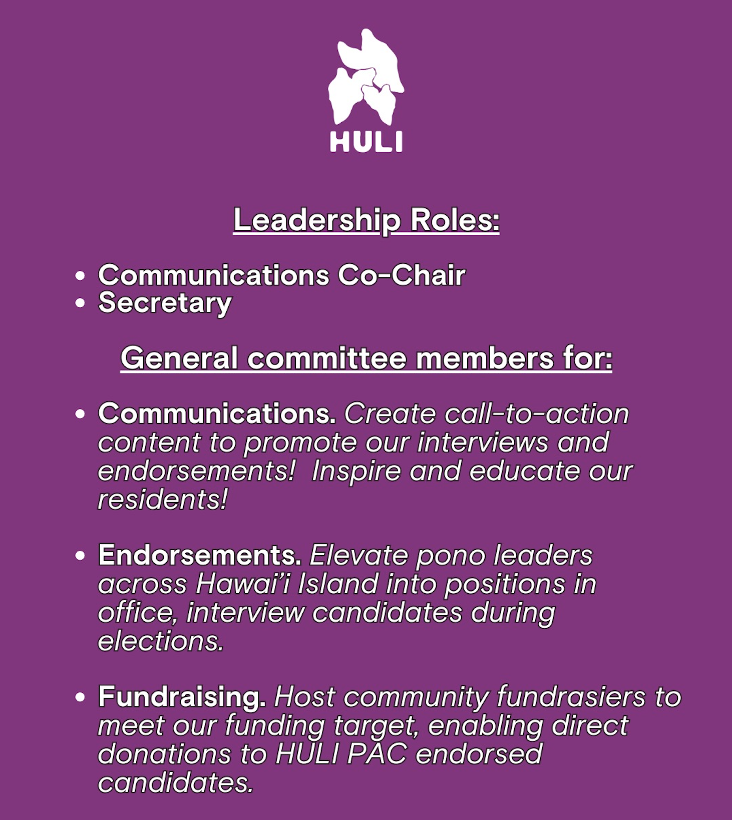 Join us on this visual journey as we reveal the spirit of HULI PAC, the heart and soul of our organization, our core values, vision, and mission, and our unwavering determination to drive positive change through political action.