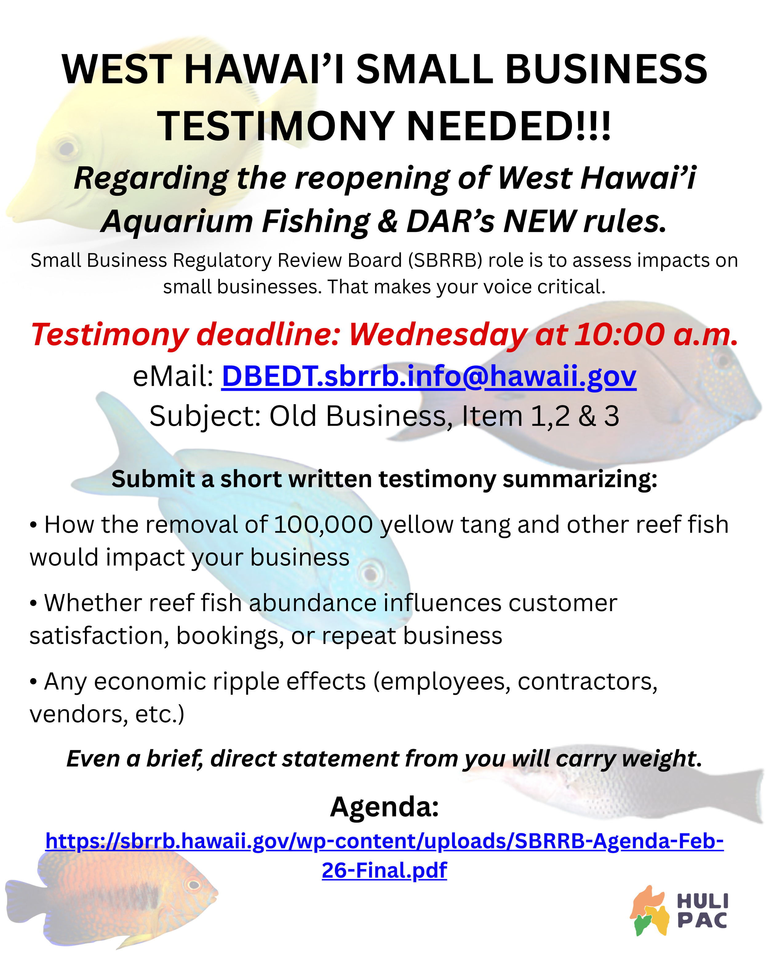 Marine tour operators were asked to disclose account ID numbers and specific reef operating locations — information not requested of aquarium collectors. At the same time, collectors appear to have had at least two weeks’ advance awareness that this matter would return to the SBRRB, while operators and the public only learned of the hearing when the agenda was emailed on Friday. The 72 pages of collector submissions included in DAR’s packet are undated and were routed through the proposing agency before being provided to the Board. This means the participation conditions were not equivalent, and the Board may not yet have a balanced small-business record that reflects the full economic impacts on marine tour operators.